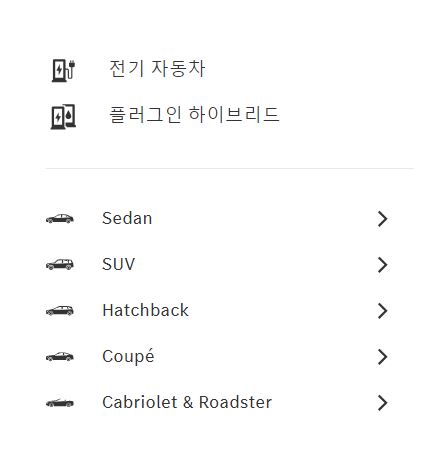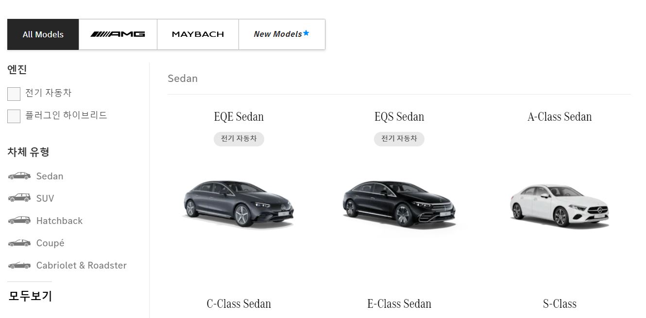 벤츠 차량 구분은 일반적으로 hatchback, Sedan, Coupe, Cabriolet & Roadster, SUV 종류로 나뉘며, AMG, MAYBACH가 포함되어 있습니다.